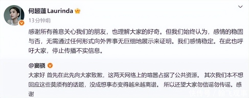 希望今后面对公众人物的情感生活,大众能够摒弃主观臆测,拒绝情绪化解读。